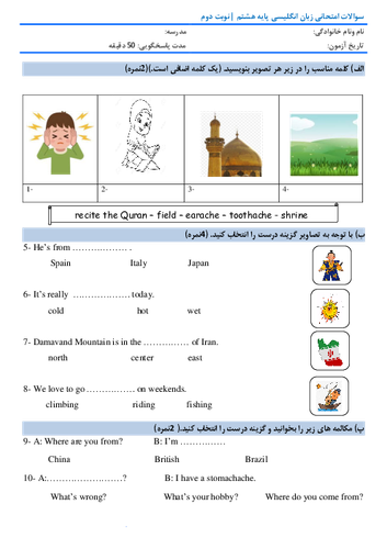 نمونه سوال تستی انگلیسی درس 1 تا 6 پایه هشتم همراه با پاسخنامه کلیدی
