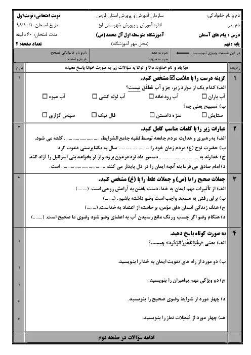 امتحان ترم اول پیامهای آسمان نهم مدرسه آل محمد | دیماه 98: درس 1 تا 7