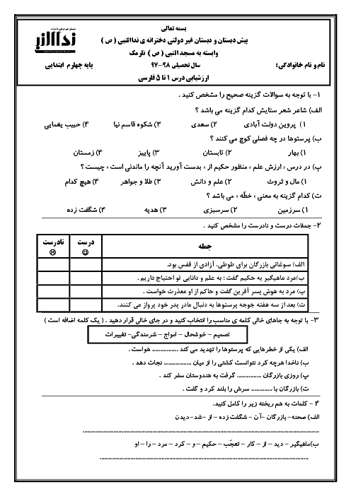 آزمون مداد کاغذی فارسی چهارم دبستان نداء النبی | درس 1 تا 5