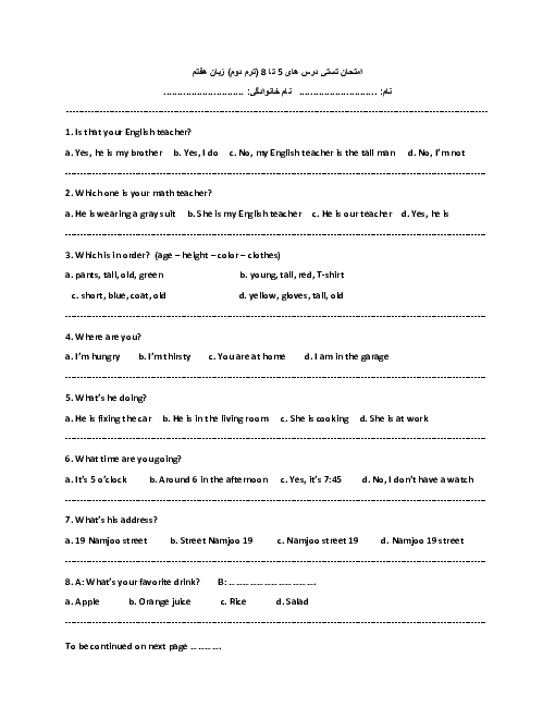 نمونه سوال امتحانی تستی درس 5 تا 8 انگلیسی هفتم همراه با پاسخنامه تشریحی