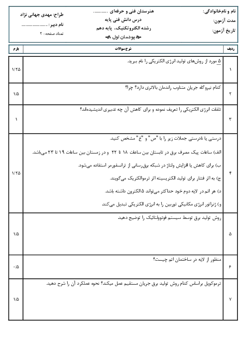 امتحان پودمان اول دانش فنی پایه سال دهم رشته الکتروتکنیک | تولید انرژی الکتریکی