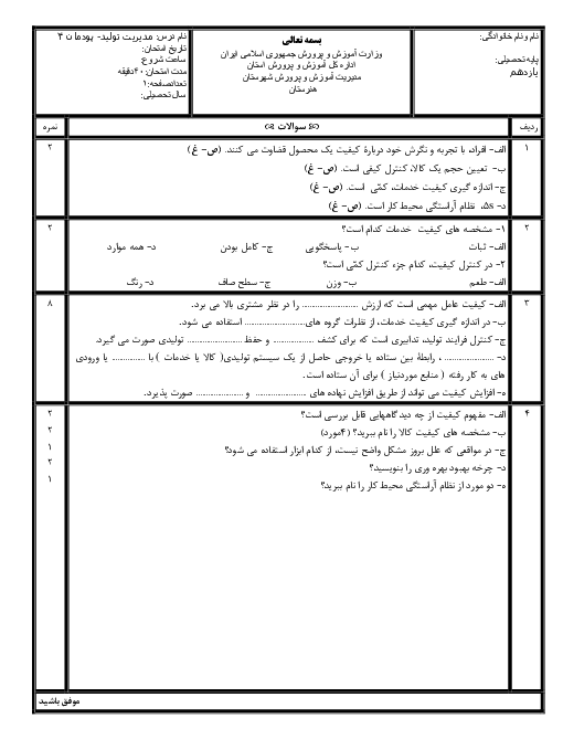 نمونه سوالات امتحان پودمان 4: مدیریت کیفیت مدیریت تولید یازدهم هنرستان فنی حرفه ای همراه با پاسخنامه تشریحی