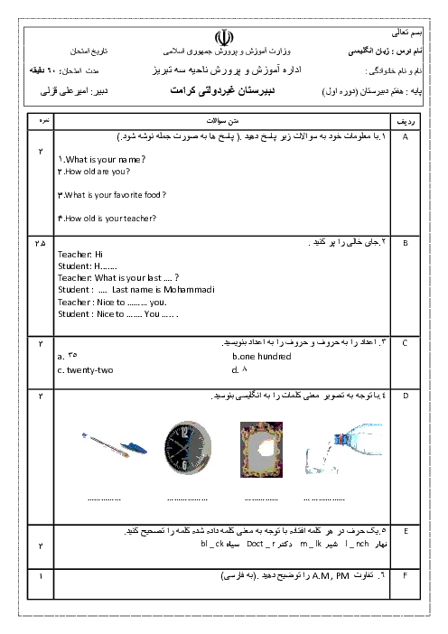 آزمون پیش نوبت دوم انگلیسی هفتم مدرسه کرامت | اردیبهشت 1398 + پاسخ