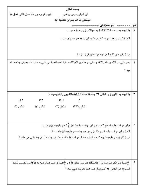 آزمون ریاضی پنجم دبستان شاهد | فصل های ۱ تا ۵