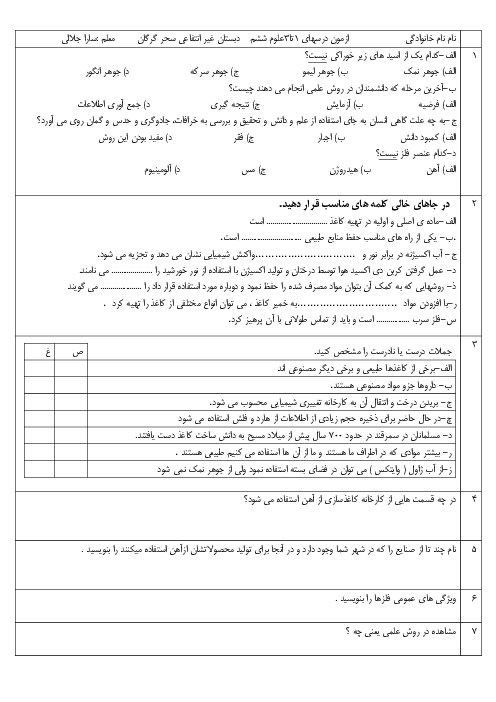 ارزشیابی علوم پایه ششم دبستان سحر | درس 1 تا 3