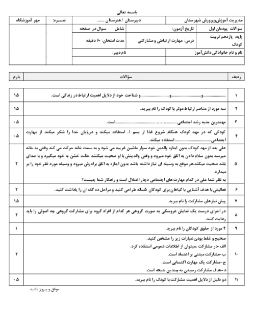 آزمون پودمانی پرورش مهارتهای ارتباطی و مشارکتی یازدهم | پودمان ١ تا پودمان 5 شامل مربی با کودک ، مربی با والدین و مدیر و کارکنان و ورود و خروج.