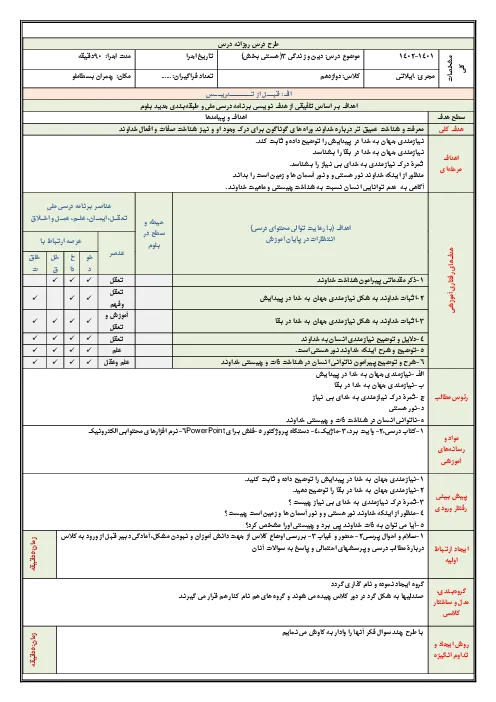 طرح درس روزانه دین و زندگی (3) دوازدهم انسانی | درس 1: هستی بخش