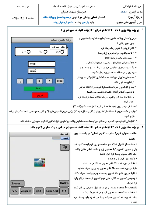نمونه سوال امتحان عملی پودمان 3: طراحی واسط گرافیکی توسعه برنامه سازی و پایگاه داده یازدهم هنرستان