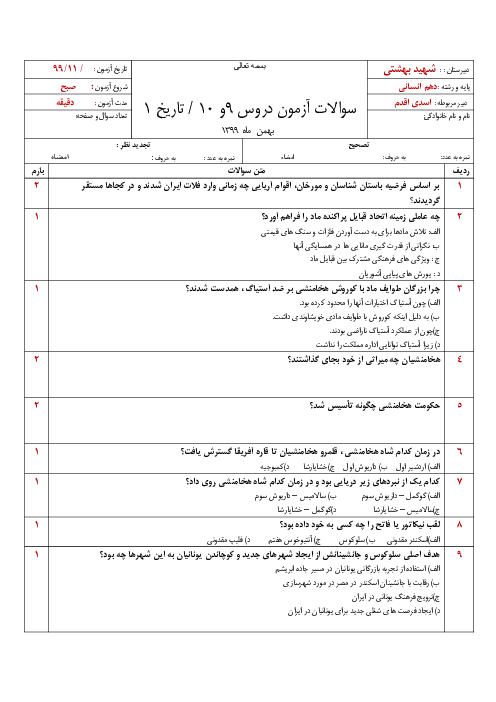 نمونه سوال امتحانی درس 9 و 10 تاریخ (1) دهم انسانی بهمن 99 همراه با پاسخنامه تشریحی