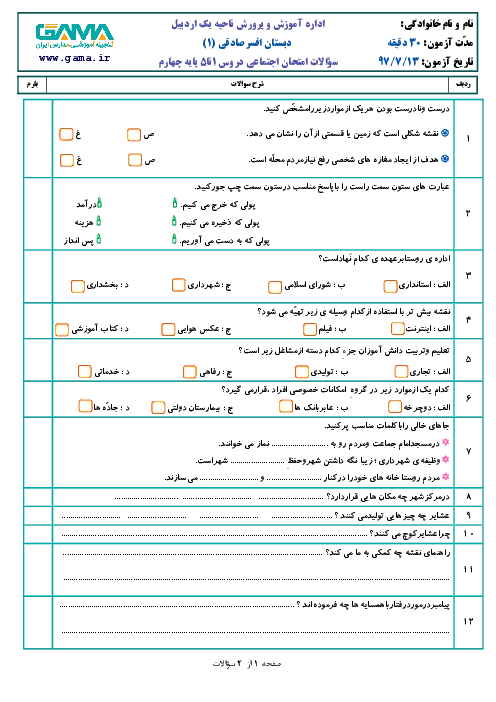 نمونه سوالات درس مطالعات اجتماعی(درس 1 تا 5) پایه چهارم دبستان همراه با پاسخنامه تشریحی