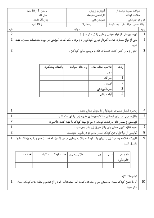 نمونه سوال امتحانی پودمان سوم مراقبت از سلامت کودک | فصل 3: کنترل بیماریهای شایع کودکان پایه دهم