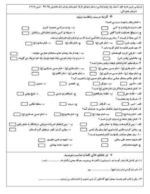 آزمون امتحانی ارزشیابی مستمر کتاب هدیه های آسمانی درس 8 تا 17 پایه پنجم دبستان