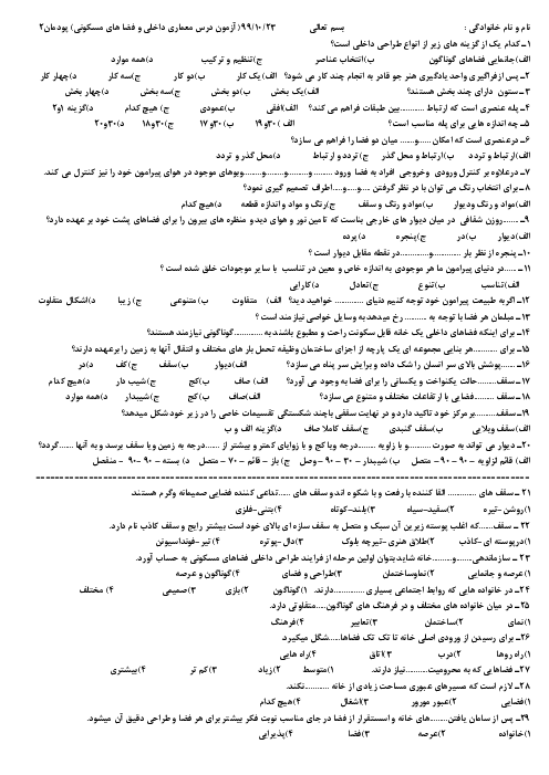 نمونه سوالات پودمانی درس معماری داخلی فضاهای مسکونی(پودمان 2: طراحی فضاهای داخلی مسکونی) پایه یازدهم