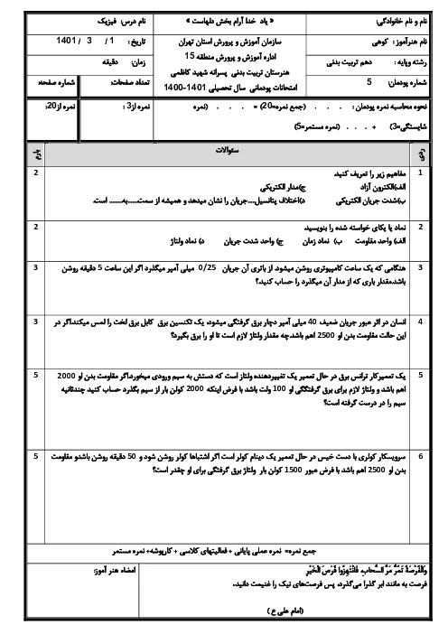 آزمون پودمانی فیزیک فنی دهم هنرستان شهید کاظمی | فصل 5: جریان و مدارهای الکتریکی