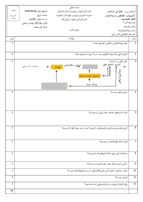 امتحان طراحی و نصب تاسیسات حفاظتی و ساختمان های هوشمند یازدهم هنرستان فنی شهید سورکی آزاد | پودمان 1: برق اضطراری و پشتیبان