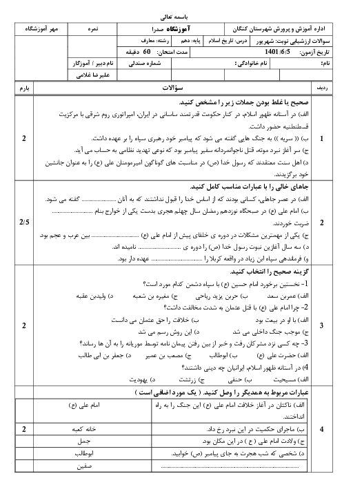 سوالات آزمون جبرانی ترم دوم تاریخ اسلام (1) دهم دبیرستان ملاصدرا | خرداد 1401