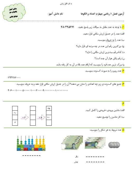 نمونه سوال امتحانی ترم مداد کاغذی درس ریاضی | فصل 1: اعداد و الگوها پایه چهارم دبستان
