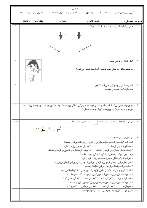 ارزشیابی مستمر فصل 6 تا 10 علوم تجربی نهم دبیرستان زینب کبری چاهملک