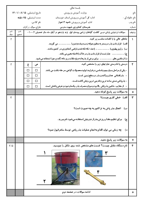 سوالات امتحان تئوری کاشت گیاهان زراعی یازدهم هنرستان کشاورزی مدرس | پودمان 1: بذرپاشی