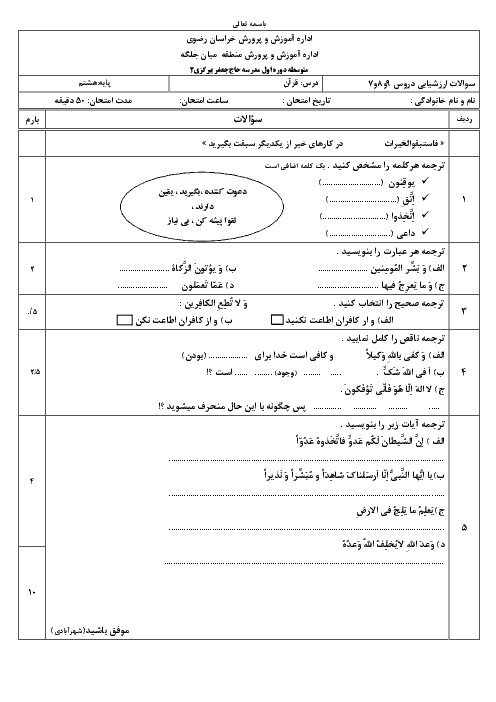 ارزشیابی قرآن هشتم مدرسه حاج جعفر پیرگزی | درس 7 و 8 و 9