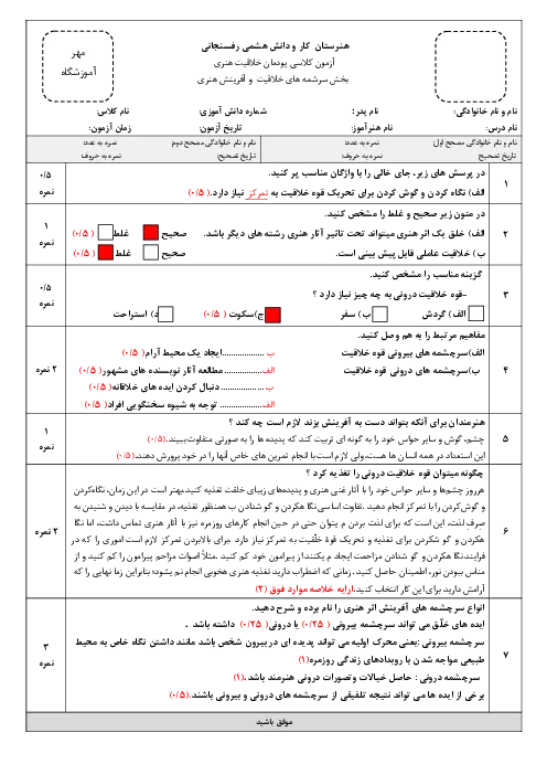پودمان 2: خلاقیت هنری.بخش سرچشمه های خلاقیت آفرینش اثر هنری از ده نمره مباشد.