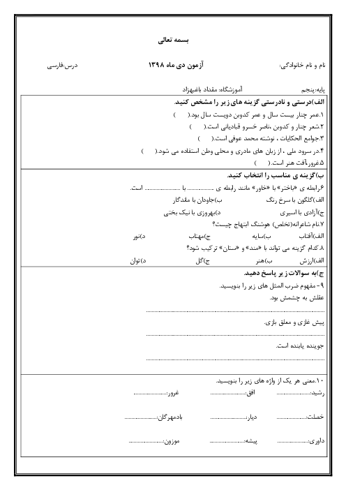 آزمون نوبت اول فارسی کلاس پنجم دبستان مقداد | دی 1398