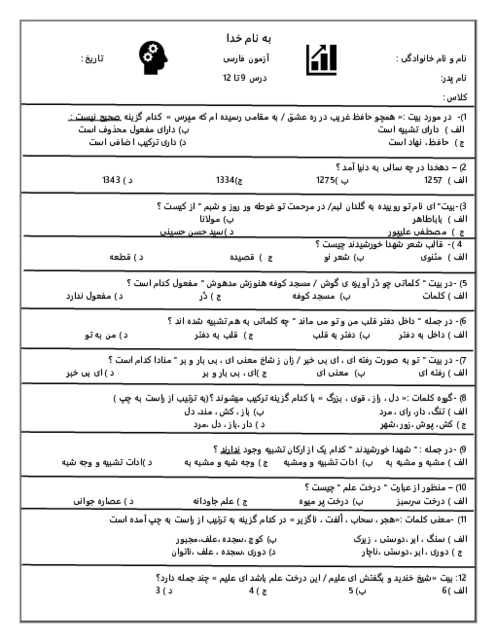 سوالات ترکیبی تستی وتشریحی به همراه جدول پاسخنامه برای سوالات تستی در قالب کتاب خوانداری و نوشتاری از درس 9 تا درس دوازدهم فارسی پایه ششم ابتدایی