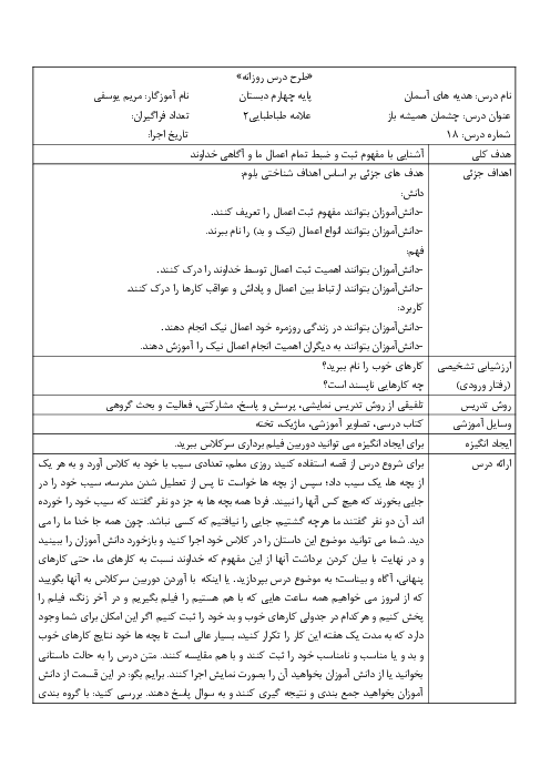 طرح درس و الگوی تدریس کتاب هدیه درس 18: چشمان همیشه باز | کلاس چهارم دبستان