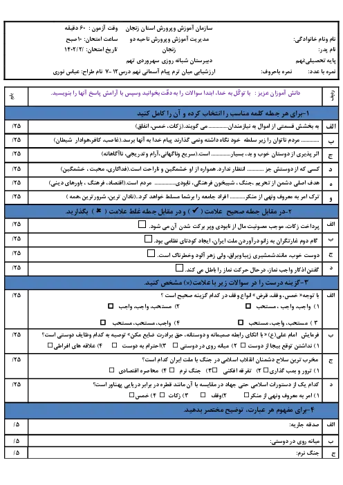 سوال استاندارد میان ترم پیام نهم با سوالات متنوع با بارم بندی جدید با پاسخ تشریحی