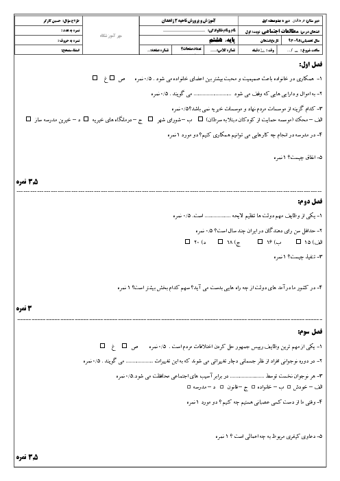 نمونه سوال امتحانی ترم اول دی 1397 درس مطالعات اجتماعی پایه هشتم