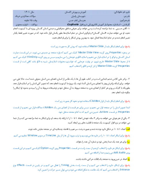 سوالات امتحان عملکردی محتواساز آموزش الکترونیکی (هشت سوال عملی و دو سوال تستی) دوازدهم