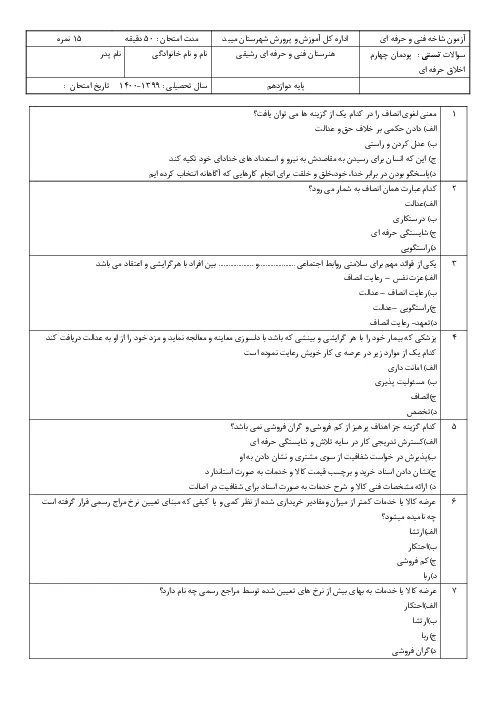 نمونه سوال امتحانی تستی درس اخلاق حرفهای م | پودمان 4: رعایت انصاف پایه دوازده همراه با پاسخنامه کلیدی