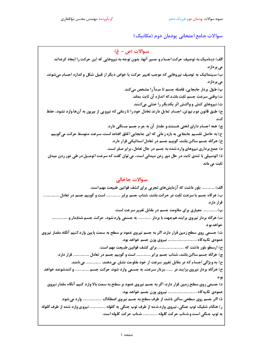 سوالات امتحان جامع پودمان دوم فیزیک فنی دهم هنرستان | فصل 2: مکانیک