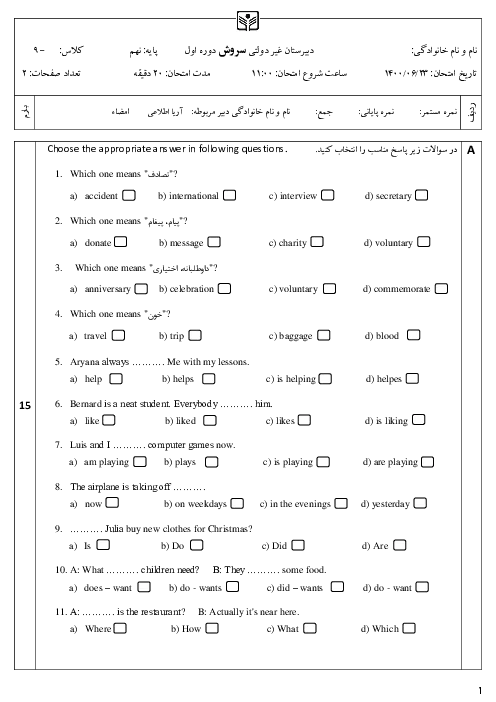 سوالات آزمون نوبت دوم درس زبان انگلیسی پایه نهم دبیرستان غیر دولتی سروش | شهریور 1400
