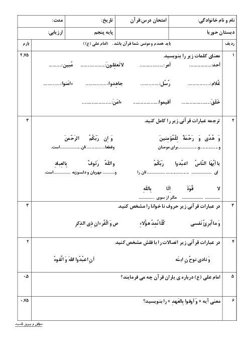آزمون نوبت اول قرآن پنجم دبستان حوریا | دیماه 99: درس 1 تا 7