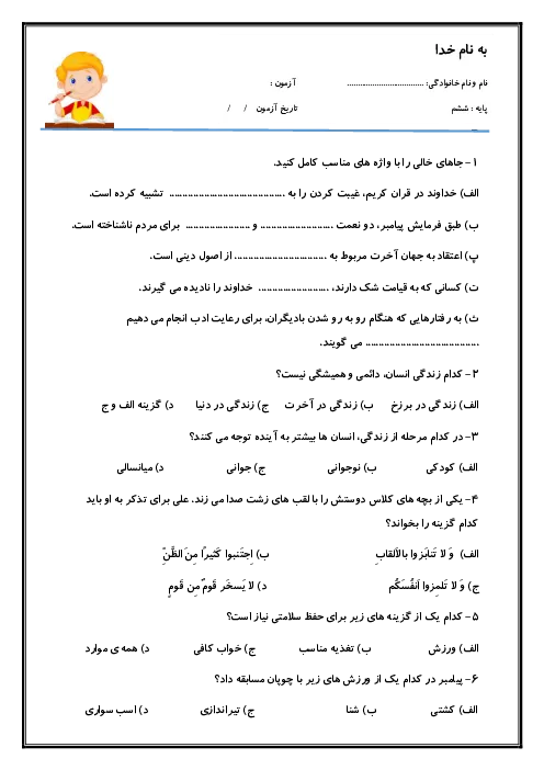 نمونه سوال امتحانی مستمر درس هدیه های آسمانی درس 9 تا 11 پایهی ششم ابتدایی همراه با پاسخنامه تشریحی