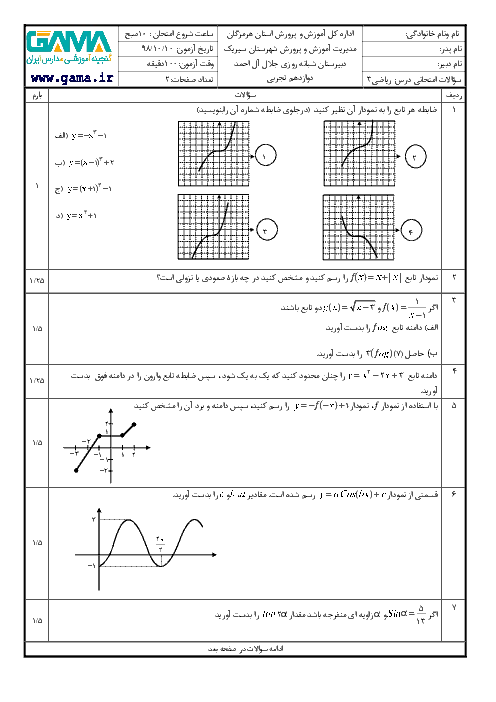 آزمون نوبت اول ریاضی (3) دوازدهم دبیرستان شبانه روزی جلال آل احمد | دی 98