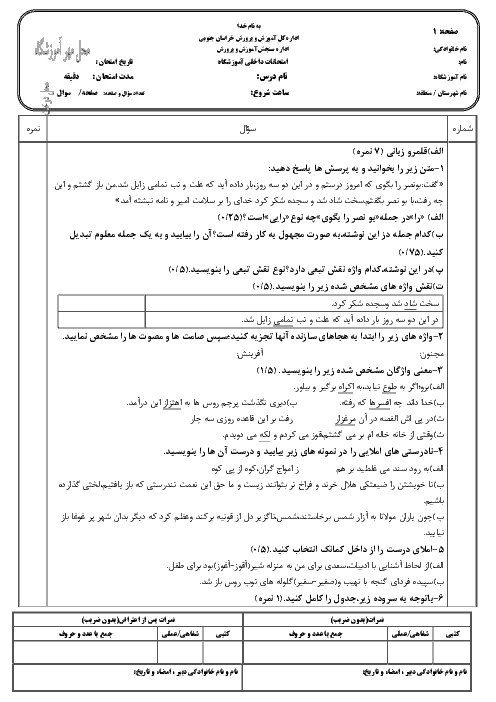 امتحان نوبت اول فارسی (2) یازدهم دبیرستان علامه طباطبایی اسفدن قائنات - دیماه 96