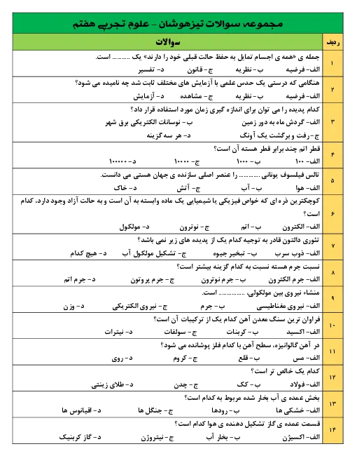 آزمون تستی کتاب علوم تجربی تکمیلی هفتم | فصل 1 تا 6