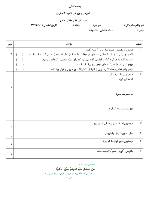 آزمون پودمانی مدیریت تولید یازدهم هنرستان کاردانش حکیم | پودمان 2: مدیریت منابع تولید