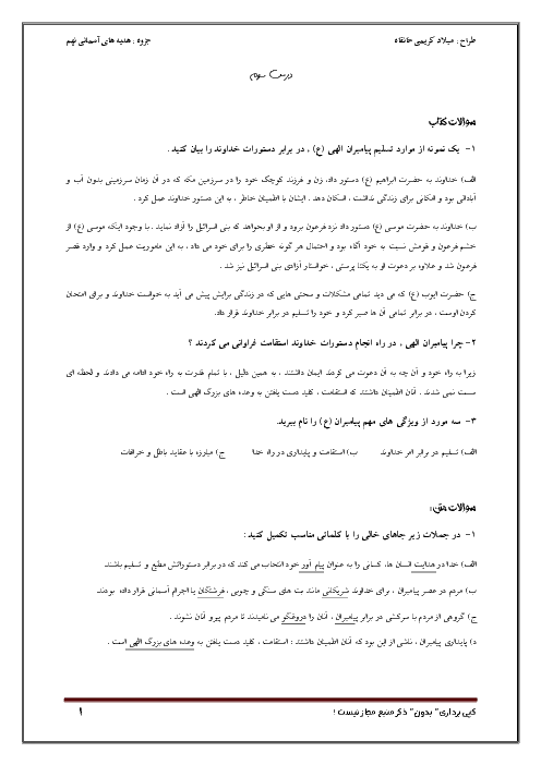 آزمون درس دوم کتاب پیامهای آسمان پایه نهم همراه با پاسخنامه تشریحی