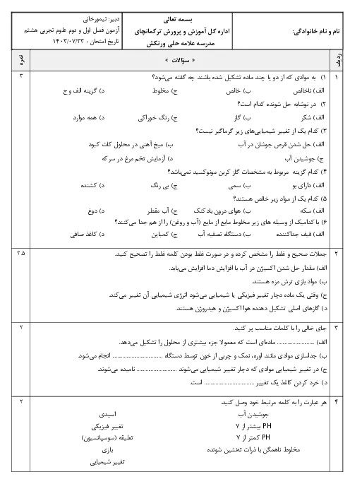 امتحان مستمر فصل 1 و 2 درس علوم هشتم دبیرستان علامه حلی ورنکش