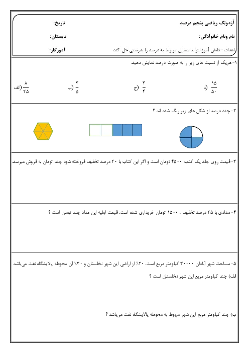 آزمونک مداد کاغذی ریاضی پنجم دبستان | فصل3 | درس 4: درصد