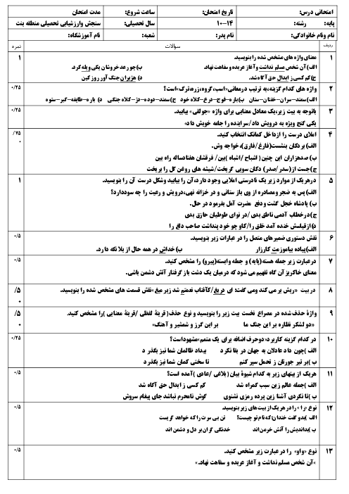 نمونه سوال امتحانی درس فارسی درس 10 تا 14 پایه دهم همراه با پاسخنامه تشریحی