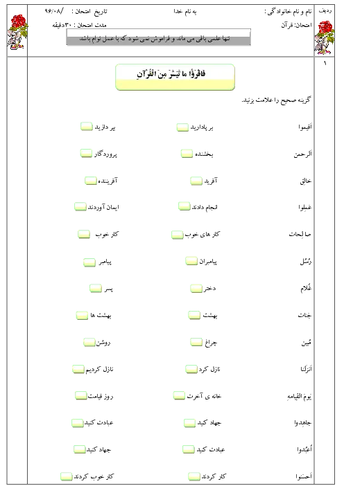 نمونه سوال ارزشیابی مستمر درس آموزش قرآن درس 1 تا 4 پایه پنجم دبستان
