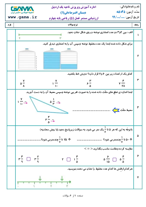 ارزشیابی مدادکاغذی ریاضی چهارم دبستان افسرصادقی | فصل 5: عدد مخلوط و عدد اعشاری