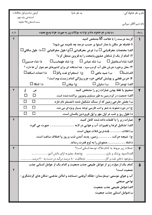 آزمون میانترم درس 1 تا 10 مطالعات اجتماعی پایه نهم دبیرستان پیشرو