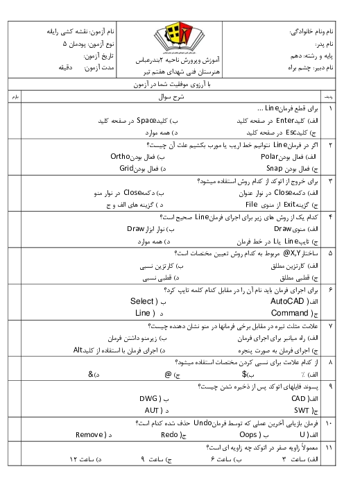 نمونه سوال امتحانی تستی درس نقشه کشی فنی رایانهای- گروه مکانیک | پودمان 5: ترسیم نقشه با رایانه پایه دهم همراه با پاسخنامه کلیدی