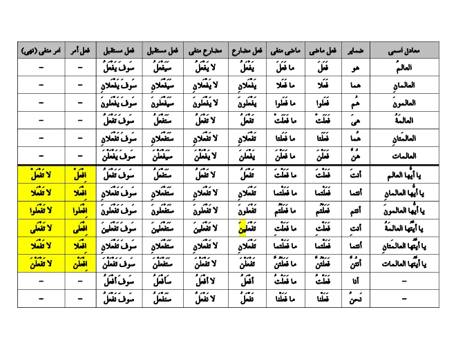 ضمایر فعل ماضی ماضی منفی فعل مضارع مضارع منفی فعل مستقبل فعل مستقبل فعل أمر امر منفی (نهی)