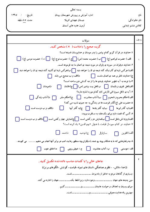 آزمون ارزشیابی مستمر درس هدیه های آسمانی پایه ششم دبستان